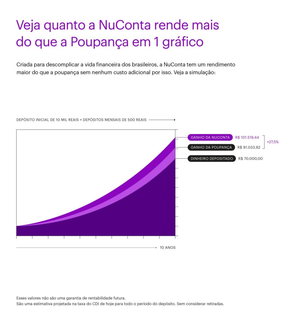 No gráfico a seguir, veja a comparação do rendimento da NuConta e da poupança: