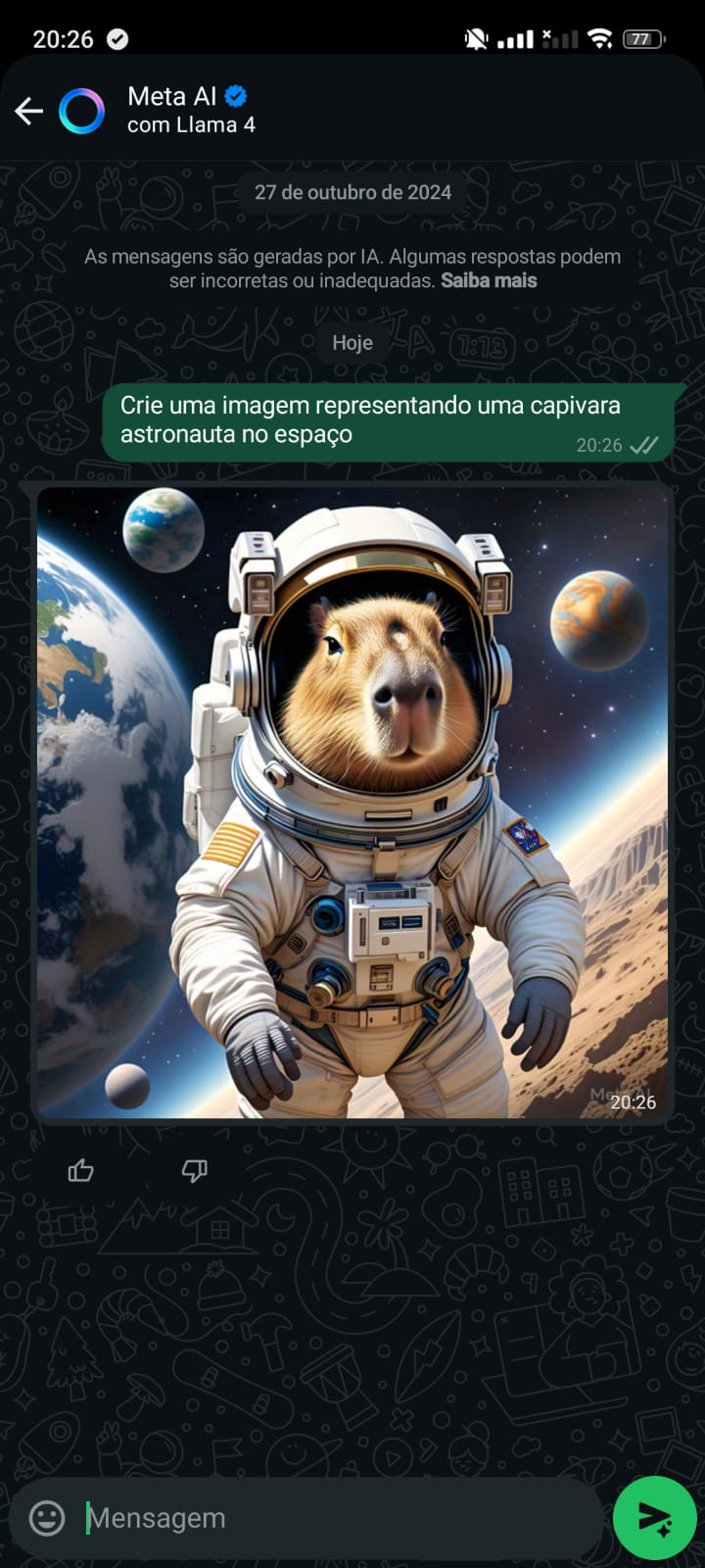 Uma das funcionalidades mais interessantes do “modo capivara” é a geração de imagens personalizadas utilizando inteligência artificial. Para acessar, basta abrir o WhatsApp, tocar no ícone do círculo azul e usar o assistente Meta AI.