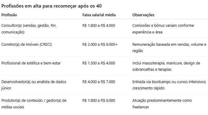 Algumas carreiras oferecem entrada rápida, flexibilidade e bons rendimentos, muitas vezes com atuação autônoma ou como prestador de serviços. Profissionais com experiência de vida e facilidade de relacionamento costumam se destacar nessas áreas.